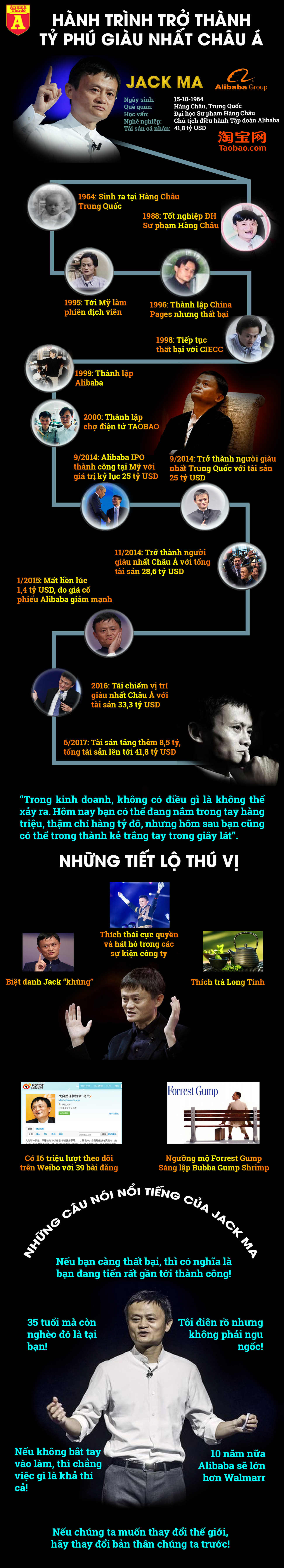 Đầu óc sắc bén, sự kiên trì và tính ham học hỏi đã giúp Jack Ma, từ một đứa trẻ bần hàn, một sinh viên trung bình, một nhân viên bị các công ty từ chối đã vụt trở thành một người được ngưỡng một trên khắp thế giới. Cùng điểm qua những cột mốc đáng nhớ trong cuộc đời vị tỷ phú giàu nhất Châu Á này.