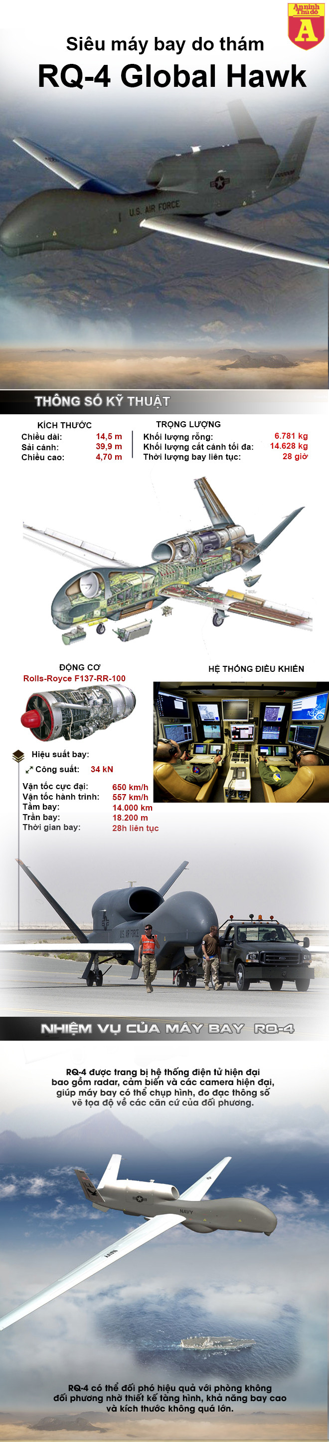 Theo đó, máy bay do thám RQ-4 Global Hawk không cần người điều khiển trực tiếp, nó có thể lửng lơ trên bầu trời của đối phương hàng ngày liền trước khi phải trở về căn cứ để tiếp nhiên liệu. Với trần bay trên 18km, việc đánh chặn loại máy bay này hết sức khó khăn. Cùng xem thông số chi tiết của loại máy bay này qua infographic dưới đây.