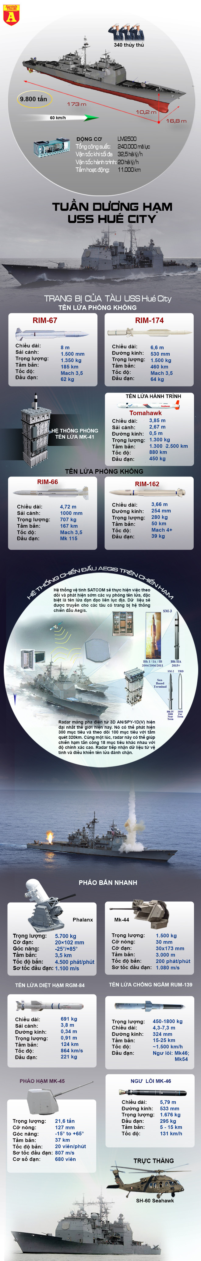 Với trang bị điện tử cực kỳ hiện đại, hệ thống vũ khí vô cùng tối tân, tuần dương hạm USS Hué City (CG-66) được coi là con quái vật trên biển. Thậm chí kho vũ khí được triển khai trên chiếc tàu này bao gồm các loại tên lửa hành trình Tomahawk có thể thổi bay một thành phố.