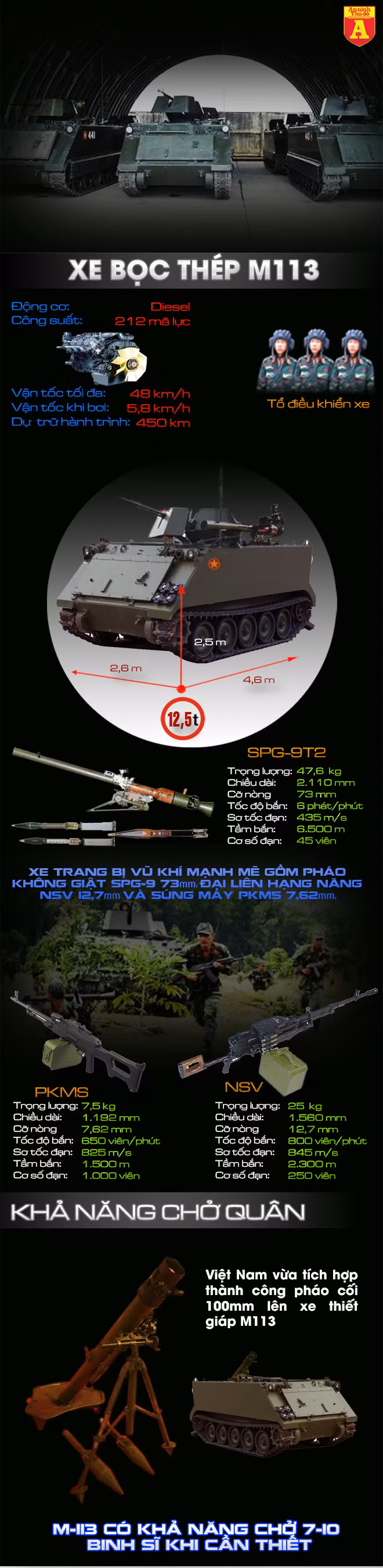 Việt Nam vẫn đang biên chế một số lượng lớn thiết giáp M113, đây là chiến lợi phẩm thu được từ quân đội Việt Nam Cộng hòa. Hiện Việt Nam đã từng bước làm chủ công nghệ bảo trì, thậm chí nền công nghiệp quốc phòng còn cải tiến để biến những xe thiết giáp chở quân đơn thuần này thành những xe chiến đấu bộ binh đúng nghĩa.