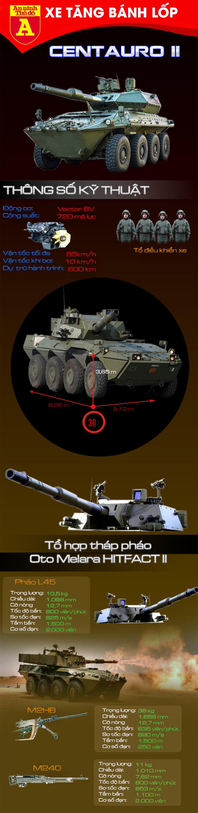 Centauro II là biến thể mới nhất của dòng xe bọc thép Centauro, được trang bị pháo thế hệ ba 120/45mm, có cơ cấu nạp bán tự động, đặc tính đường đạn cao tốc, bộ hãm nòng và cơ cấu giảm giật, được trang bị cảm biến (sensor) đo sơ tốc đạn. Đạn xuyên giáp dưới cỡ 120 mm phát triển cho pháo này có khả năng xuyên giáp thép đồng nhất (RHA) 600 mm từ cự ly 3.000m. Centauro II được trang bị tháp (khoang chiến đấu) mới Oto Melara HITFACT II (Highly Integrated Technology, Fire Against Combat Tank) làm bằng giáp nhôm lắp thêm giáp chống đạn bên trên được phát triển dành riêng cho xe này. Quân số trong tháp xe gồm 3 người (trưởng xe, pháo thủ, pháo thủ nạp đạn) ngồi trên các ghế xe chống mìn.