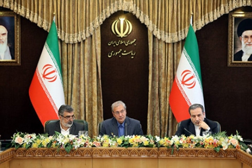 Từ trái qua phải: Người phát ngôn Cơ quan Năng lượng Nguyên tử Iran Behrouz Kamalvandi, phát ngôn viên chính phủ Ali Rabiei và Thứ trưởng Ngoại giao Abbas Araghchi trong buổi họp báo ở phủ tổng thống tại Tehran hôm 7/7. Ảnh: AFP.