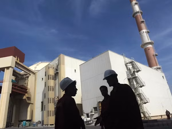 Công nhân Iran đứng trước nhà máy năng lượng hạt nhân Bushehr