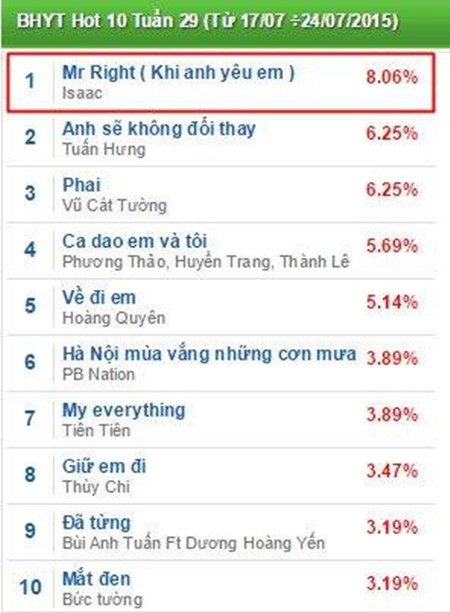 Hiện tại, "Mr. Right" của Isaac đang “làm mưa làm gió” tại các bảng xếp hạng âm nhạc khi liên tục nằm trong top những MV được xem nhiều nhất trong thời gian qua (đứng nhất bảng xếp hạng MV tại Zing và dẫn đầu bình chọn của chương trình "Bài hát yêu thích" tháng 7). Không chỉ vậy single đầu tay “Mr. Right” của Isaac cũng đã "tẩu tán" được 1.000 đĩa chỉ trong tuần đầu phát hành khi anh lần lượt tổ chức các buổi ký tặng tại TP.HCM, Cần Thơ cũng như "cháy hàng" tại Hà Nội và Đà Nẵng. Ca khúc "Mr.Right" là sản phẩm được kết hợp bởi nhạc sĩ OnlyC, Hoàng Touliver, Long Halo, Mr.Doji.