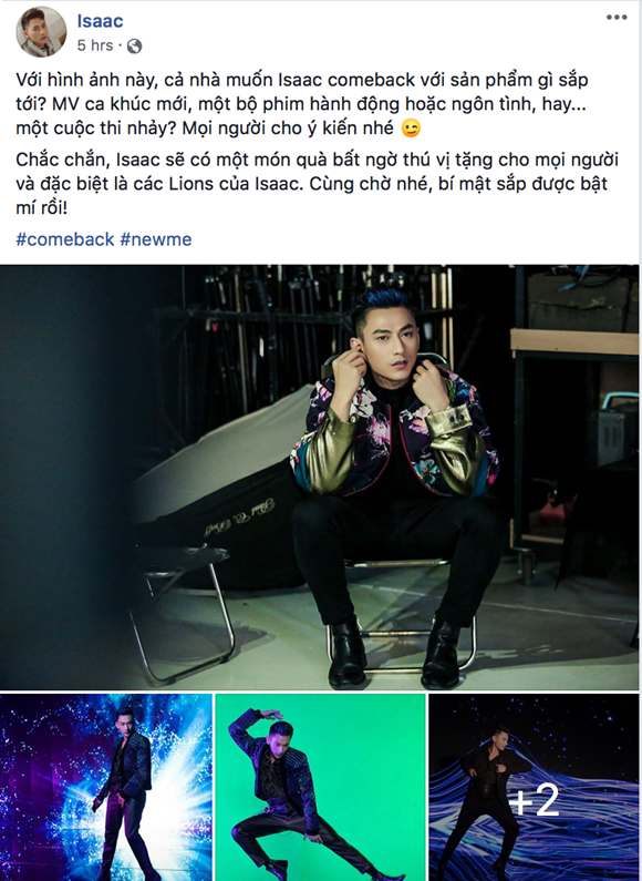 Anh viết: “Với hình ảnh này, cả nhà muốn Isaac comeback với sản phẩm gì sắp tới? MV ca khúc mới, một bộ phim hành động hoặc ngôn tình, hay... một cuộc thi nhảy? Mọi người cho ý kiến nhé. Chắc chắn, Isaac sẽ có một món quà bất ngờ thú vị tặng cho mọi người và đặc biệt là các Lions của Isaac. Cùng chờ nhé, bí mật sắp được bật mí rồi!”. Dòng chia sẻ nhận về rất nhiều phản hồi từ cư dân mạng với những mong muốn gửi tới giọng ca "Anh sẽ về sớm thôi".