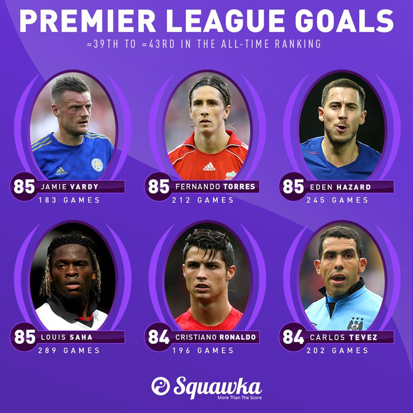 Trong khi đó, dù cùng có 85 bàn, nhưng Vardy chỉ "mất" 183 trận, hơn nhiều so với Fernando Torres (212 trận) và Eden Hazard (245 trận). Vẫn thi đấu nên Vardy còn nhiều cơ hội cải thiện thành tích của mình.