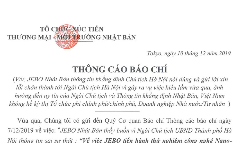 Cụ thể, thông cáo báo chí của JEBO viết: “Vừa qua, chúng tôi có gửi đến các cơ quan báo chí thông cáo báo chí ngày 7/12/2019 về việc: “JEBO Nhật Bản thấy buồn vì Ngài Chủ tịch UBND TP Hà Nội thông tin sai sự thật: “Về việc JEBO tiến hành thử nghiệm công nghệ Nano- Bioreactor làm sạch sông Tô Lịch mà chưa xin phép thành phố” trong khi thực tế là thực hiện theo văn bản Thông báo số 142/TB-VP ngày 09/5/2019 của chính UBND TP nêu rõ đồng ý cho phép JEBO thực hiện”.