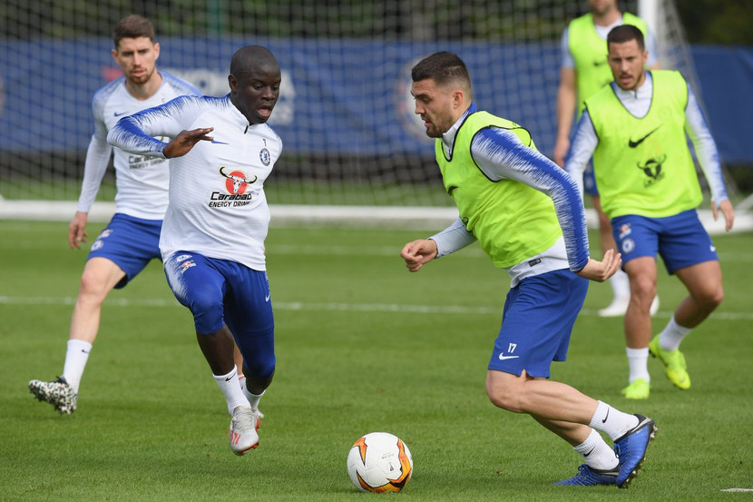 Kante (trái) trong buổi tập mới nhất cùng Chelsea