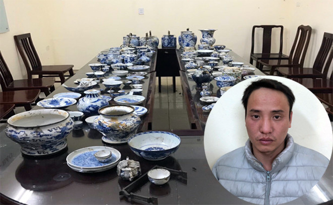 Đối tượng Sơn và số cổ vật trộm cắp tại nhà chị H. được cơ quan Công an thu giữ