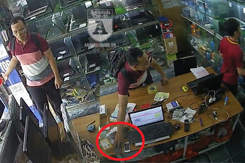Chỉ trong vài giây, kẻ gian đã lấy trộm trót lọt chiếc điện thoại trên, đút vào túi quần. Sau đó, đối tượng này vờ lấy điện thoại ra nghe một cách tỉnh bơ, rồi kiếm cớ có việc ra ngoài và bỏ đi luôn, trong sự ngỡ ngàng của nam nhân viên.