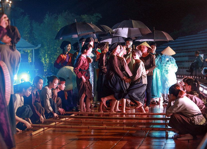 Thay vì để khán giả tiếp cận ngay với nội dung vở diễn, CNN đưa khán giả tới một khung cảnh hậu trường, những diễn viên không chuyên chân hăm hở trên nước, với ngư cụ trên tay, tập cảnh đi bắt tôm... gấp rút chuẩn bị cho màn diễn để thể hiện các phong tục văn hoá Bắc bộ Việt Nam. Một góc khác của sân khấu, các vũ công đang tập duyệt phân cảnh về cuộc sống thường ngày ở làng quê như cầm liềm gặt lúa, giã gạo...
