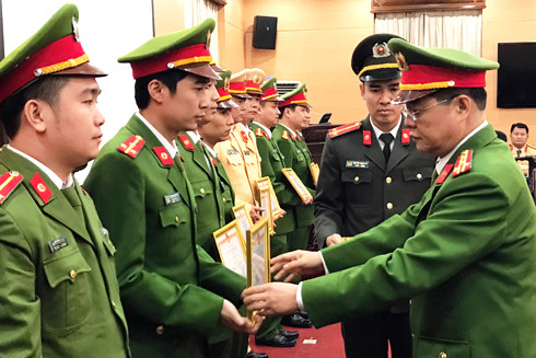 Đại tá Đào Thanh Hải, Phó Giám đốc CATP Hà Nội trao tặng giấy khen cho các tập thể, cá nhân có thành tích xuất sắc