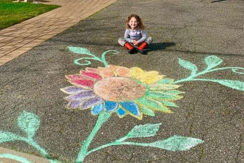 Bé Violet, 4 tuổi, ở Long Island, với bông hoa cầu vồng trước sân nhà để lan truyền hy vọng giữa cuộc khủng hoảng Covid-19