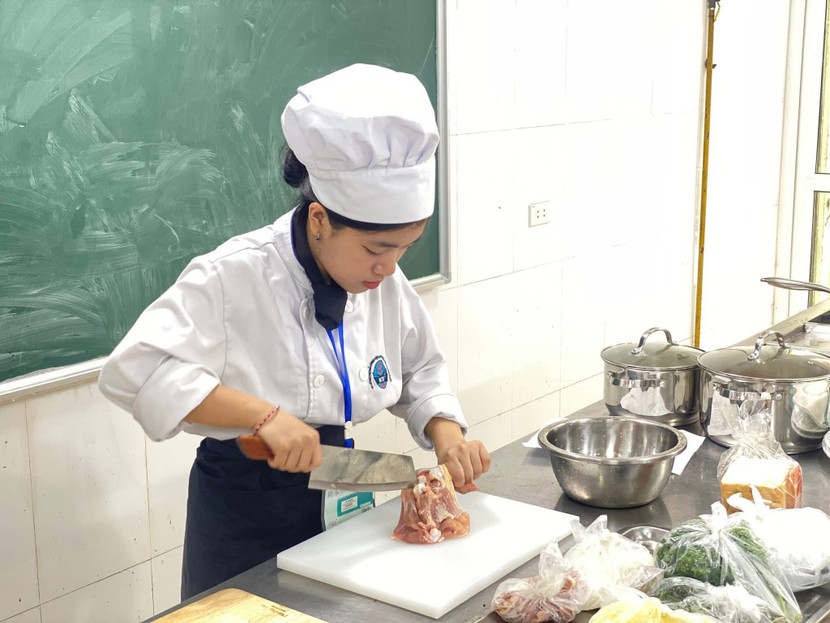 | Học viên trường Trung cấp Nghề nấu ăn, nghiệp vụ du lịch và thời trang Hà Nội thi kỹ năng nghề |