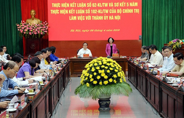 Đồng chí Trương Thị Mai cám ơn thành phố Hà Nội đã hợp tác, làm rõ nhiều vấn đề lý luận và thực tế trong 2 lĩnh vực, từ đó chỉ ra nhiều nguyên nhân và bài học kinh nghiệm quý báu, những nhiệm vụ, giải pháp hiệu quả để triển khai, thực hiện Kết luận số 62 và 102 trong tình hình mới.