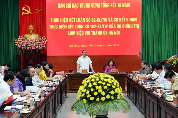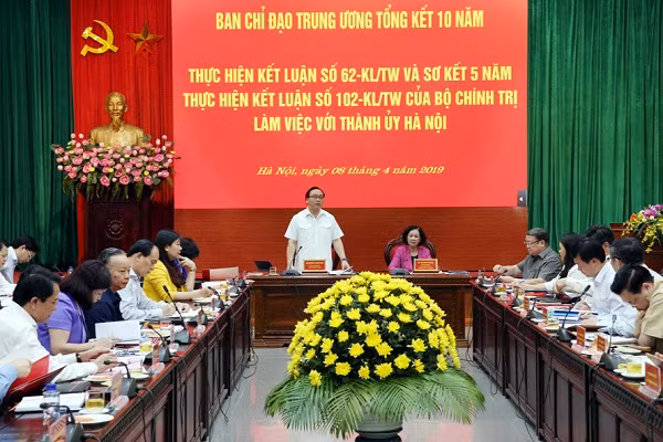 Chiều nay, 8-4, Đoàn kiểm tra của Ban Chỉ đạo Trung ương đã làm việc với Thành ủy Hà Nội về kết quả 10 năm thực hiện Kết luận 62-KL/TW của Bộ Chính trị về tiếp tục đổi mới nội dung, phương thức hoạt động của Mặt trận Tổ quốc (MTTQ) Việt Nam và các đoàn thể chính trị - xã hội; 5 năm thực hiện Kết luận 102-KL/TW, ngày 22/9/2014 của Bộ Chính trị về hội quần chúng trên địa bàn TP. Hà Nội.
