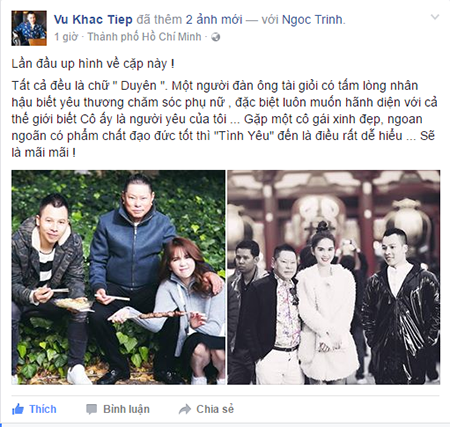 Theo Khắc Tiệp, tình yêu giữa Ngọc Trinh và ông Hoàng Kiều đều bắt nguồn từ chữ “duyên”. Anh cho rằng, chẳng có gì ngạc nhiên khi một người đàn ông tài giỏi có tấm lòng nhân hậu, lại hết lòng yêu thương, chăm sóc cô gái của mình. Trong khi đó, Ngọc Trinh lại là một cô gái xinh đẹp, ngoan ngoãn và có phẩm chất đạo đức tốt. Anh cũng không quên chúc phúc cho người bạn thân của mình.