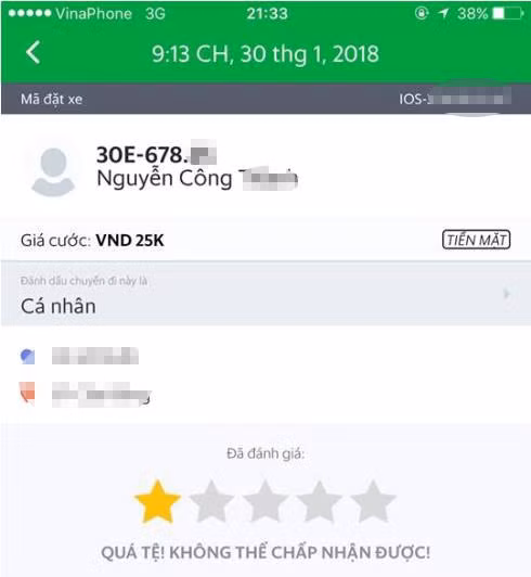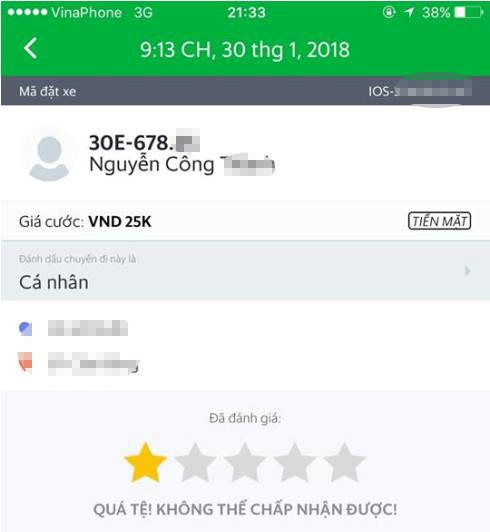 Tối 30-1, anh Lê Duy Thắng (SN 1994, trú tại quận Đống Đa, Hà Nội) và vợ (đang mang thai ở tháng thứ 8) đặt một chuyến xe GrabCar ở phố Nguyễn Khuyến, với số tiền báo phải trả là 25.000 đồng. Khi lái xe có tên Nguyễn Công T. (xe mang BKS 30E-678.**) tới đón, anh Thắng cảm thấy bức xúc vì thái độ người này “hằm hằm” do khách mang theo nhiều đồ. Mặc dù đã “tự tay đưa đồ vào cốp xe”, song theo vị khách này, anh vẫn phải nghe lái xe phàn nàn “lần sau bắt taxi mà đi”.