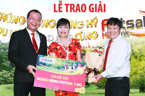 Theo đó, chị Đinh Thị Hoan, giao dịch tại HDBank Nha Trang là người may mắn nhất của chương trình, trúng thưởng quả bóng Futsal trị giá 1 kg vàng SJC theo kết quả quay số ngày 15/9, tại Đà Nẵng. Sở hữu quả bóng vàng này, chị Đinh Thị Hoan đã tiếp tục nối dài danh sách khách hàng nhận giải thưởng lớn từ HDBank.