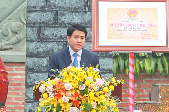 Phát biểu tại lễ kỷ niệm, Chủ tịch UBND TP Hà Nội Nguyễn Đức Chung cho biết: “Hòa trong không khí tưng bừng của những ngày đầu xuân năm mới, hôm nay, tại mảnh đất Đống Đa lịch sử, đông đảo nhân dân Thủ đô và nhân dân cả nước lại tìm về nơi đây tham dự Lễ hội kỷ niệm 230 năm chiến thắng Ngọc Hồi - Đống Đa, hướng về với tổ tiên, cội nguồn. Năm nay, trong dịp lễ hội xuân Kỷ Hợi 2019, di tích gò Đống Đa vinh dự được Thủ tướng Chính phủ quyết định xếp hạng di tích quốc gia đặc biệt, đó là sự ghi nhận những giá trị to lớn của khu di tích, trường tồn cùng với năm tháng, thời gian”.