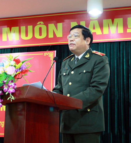 Thiếu tướng Lưu Quang Hợi, Phó Bí thư Đảng ủy, Phó giám đốc CATP phát biểu khai mạc lớp tập huấn Điều lệnh, huấn luyện quân sự, võ thuật 2016 diễn ra vào sáng nay, 7-3