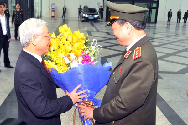 Đồng chí Bộ trưởng Tô Lâm tặng hoa chúc mừng đồng chí Tổng Bí thư Nguyễn Phú Trọng