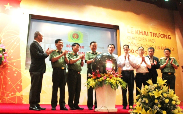 Thượng tướng Tô Lâm cùng các đồng chí lãnh đạo bấm nút khai trương giao diện mới của Cổng TTĐT Bộ Công an