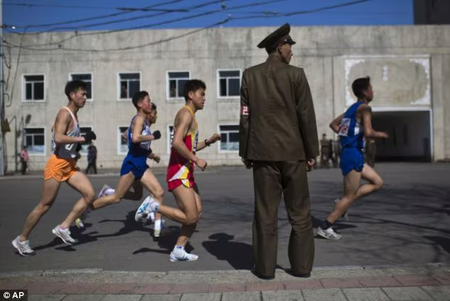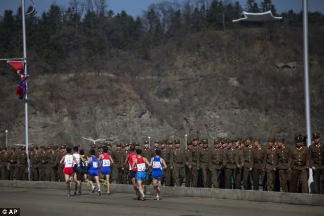 Các vận động viên maraton chạy qua một sĩ quan Triều Tiên trong cuộc đua tại Bình Nhưỡng