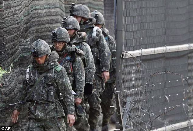 Trong khi đó quân lính Hàn Quốc đang tuần tra cạnh hàng rào thép được cho là biên giới giữa hai miền Nam - Bắc