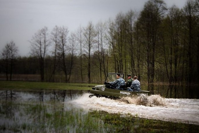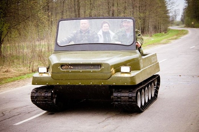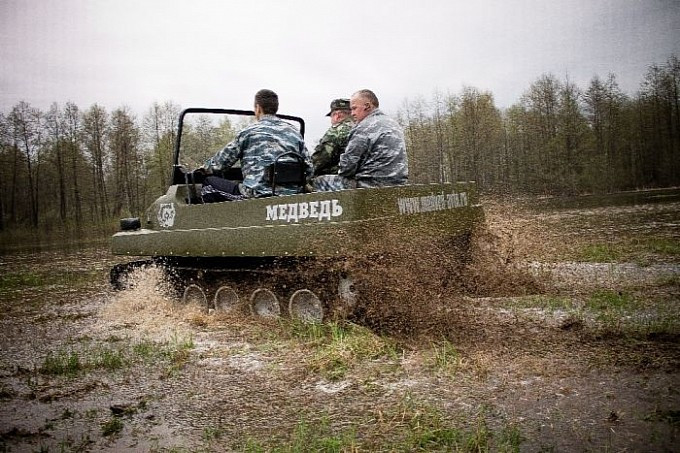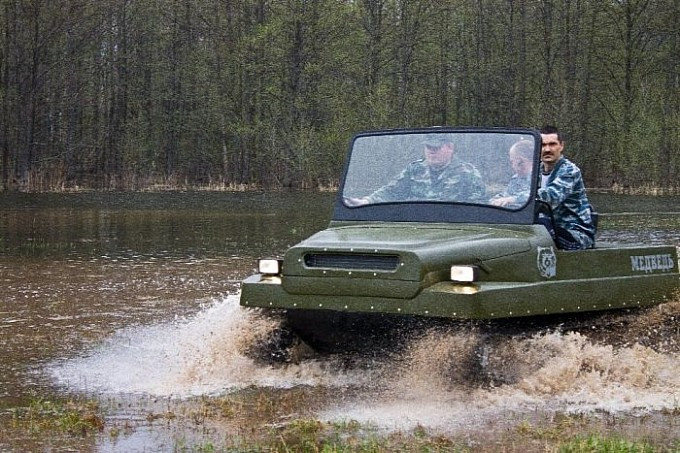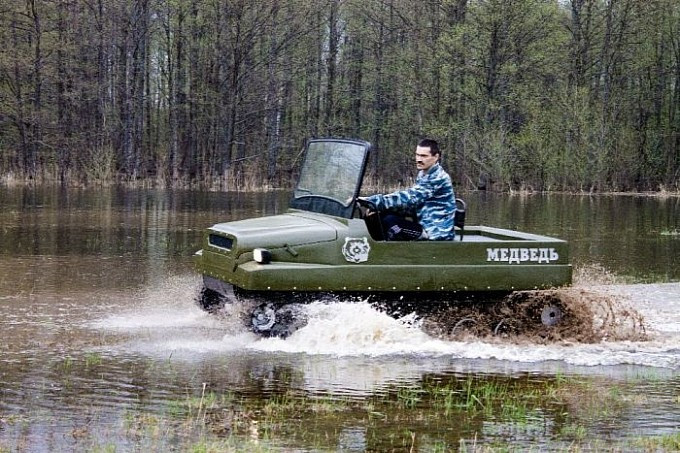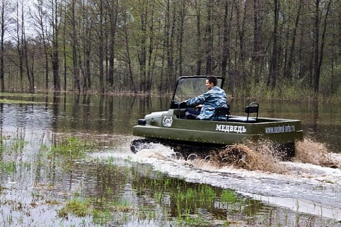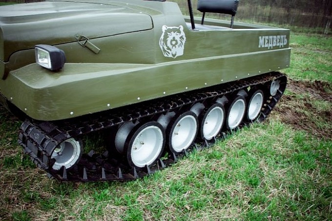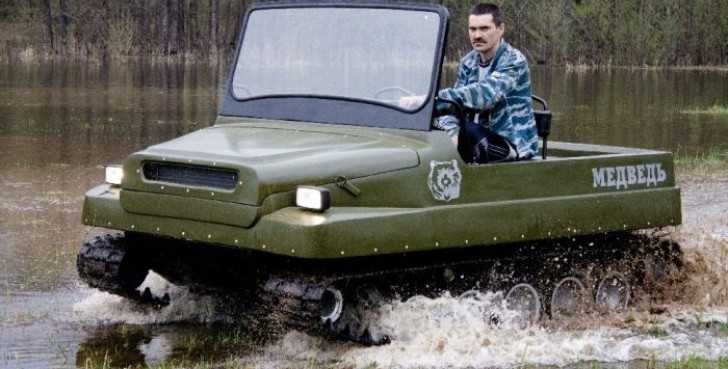 Xe tăng T-34, hay còn gọi là “gấu nước Nga” Medved, nổi tiếng với vẻ ngoài thô sơ, bộ khung đơn giản đến mức một cậu bé nhà nông cũng có thể dễ dàng điều khiển được. Thân xe được lắp ráp đơn giản từ hai bộ phận chính. Phần gầm thấp bằng kim loại có chức năng như một chiếc thuyền giúp xe tăng có thể đi được dưới nước. Phần trên của thân xe làm bằng chất liệu sợi thuỷ tinh giúp giảm tối đa trọng lượng xe. Chiếc xe tăng dã chiến đơn giản và thô sơ sử dụng động cơ Lada VAZ-2107, có khả năng càn quét ngay cả trong địa hình rừng rậm và đầm lầy.