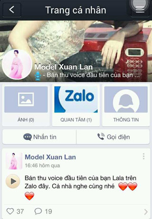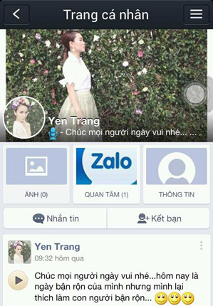 Yến Trang là một trong những cái tên rất chịu khó cập nhật thông tin, hình ảnh mới trên Zalo. Theo một số nguồn tin, cô nàng sắp công khai “ngôi nhà” cực hoành tráng trên ứng dụng này, nên chắc chắn sẽ còn thường xuyên cập nhật những ca khúc, dự án mới thông qua cách chia sẻ bằng giọng nói của Zalo.