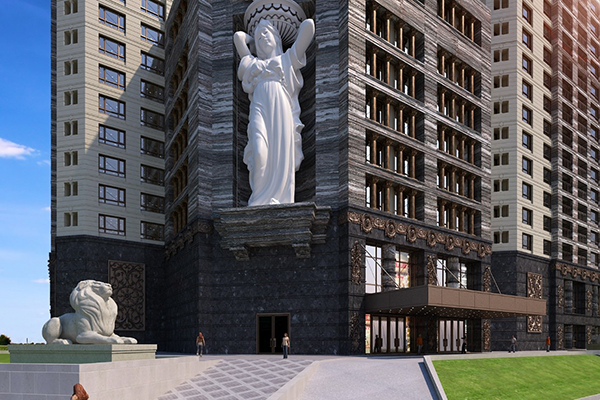 Các tòa tháp A, B của dự án được thiết kế cân xứng với nhau qua tòa tháp dịch vụ 8 tầng chính giữa, tạo ra phong thái đường bệ và trang trọng cho công trình. Toàn bộ khối đế được ốp đá granite, mặt đứng tòa nhà được tô điểm bằng những bức phù điêu chạm trổ từ đá tự nhiên mang đến vẻ đẹp bề thế, sang trọng.