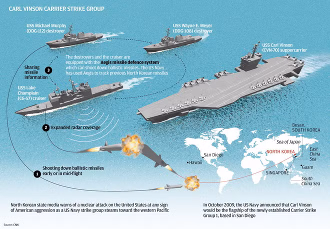 ANTD.VN - Hôm 5/3/2018, tàu sân bay USS Carl Vinson (CVN-70) đã có mặt tại Đà Nẵng, bắt đầu chuyến thăm Việt Nam. Cùng khám phá sức mạnh đội cận vệ của tàu sân bay này là tàu tuần dương USS Lake Champlain (CG-57) và tàu khu trục USS Wayne E. Meyer (DDG-108).