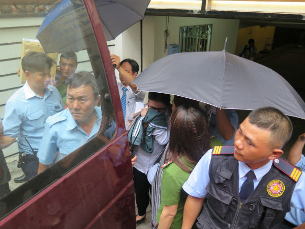 2 nữ cán bộ ngân hàng bị bắt giam được áp tải ra xe, được che kín trước ống kính phóng viên báo chí