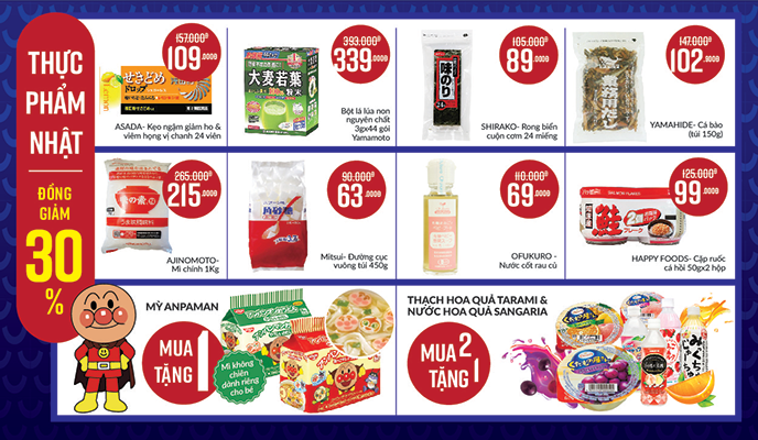 Các loại thực phẩm Nhật như thạch hương hoa quả, nước giải khát vị hoa quả đều được áp dụng mua 2 tặng 1. Mỳ Anpaman không chiên, dành riêng cho trẻ nhỏ cũng được áp dụng mua 1 tặng 1. Phần lớn các nhóm hàng thực phẩm Nhật nhiều dinh dưỡng, nguồn gốc tự nhiên, có lợi cho sức khoẻ cũng nằm trong cơn bão săn hàng Nhật.
