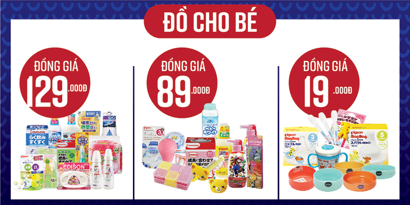 Cơn mưa ưu đãi cho đồ mẹ và bé cũng đang “tung hoành” trên hệ thống siêu thị hàng Nhật nội địa. Đồ dùng cho bé với 3 mức đồng giá 19.000đ - 89.000đ - 129.000đ thực sự là “tâm bão” của đợt khuyến mại, với hàng trăm sản phẩm phục vụ cho mọi nhu cầu thiết yếu.