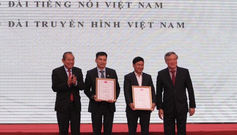 Phó Thủ tướng Thường trực Trương Hoà Bình (ngoài cùng bên trái) cùng Chánh án TAND tối cao Nguyễn Hoà Bình (ngoài cùng bên phải) trao giải cho các đơn vị có gian trưng bày đẹp tại Hội Báo toàn quốc 2019