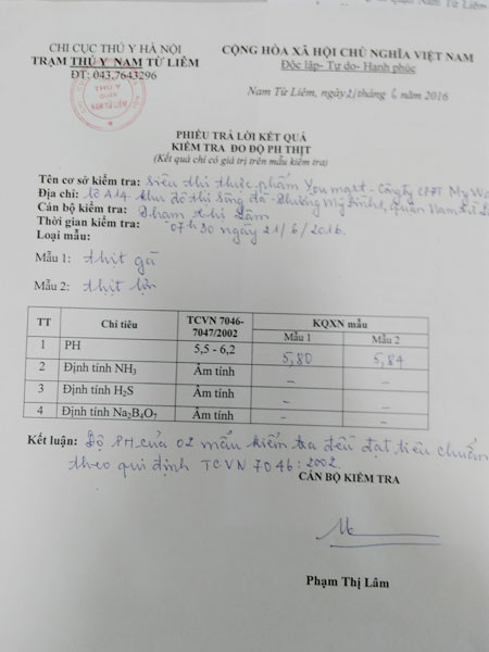 Kết quả kiểm định của Trung tâm Y tế quận và Trạm Thú y quận Nam Từ Liêm đối với mẫu thực phẩm của siêu thị Youmart