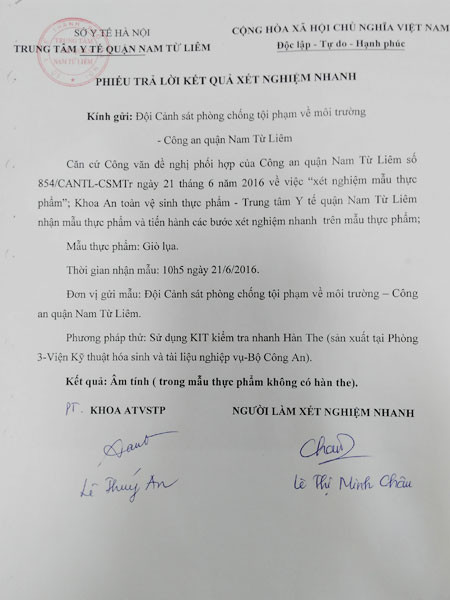 Ngoài ra, Trạm Thú y quận Nam Từ Liêm đã tổ chức kiểm định tại chỗ đối với các mặt hàng thực phẩm của siêu thị gồm thịt lợn, thịt gà; kết quả kiểm định độ PH trong ngưỡng cho phép, đủ điều kiện chế biến thực phẩm. Tổ công tác đã lấy mẫu giò lợn gửi Trung tâm Y tế quận Nam Từ Liêm kiểm định việc sử dụng hàn the và cũng có kết quả sản phẩm giò cung cấp cho trường học không có hàn the.
