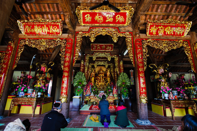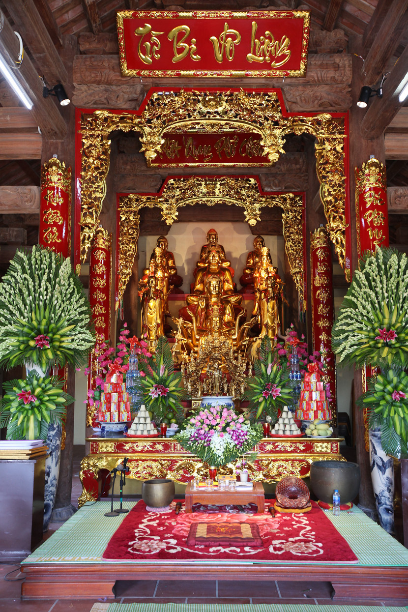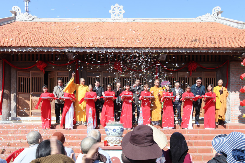 Giai đoạn 1 triển khai xây dựng Tam Bảo. Tòa Tam Bảo làm bằng gỗ lim, diện tích mặt sàn 270m2, kiến trúc truyền thống, mái cong và ngói mũi hài, tường bao xây gạch đặc, miết mạch không trát với hoa văn hoạ tiết thời Trần mang đậm chất kiến trúc đặc trưng của dân tộc.