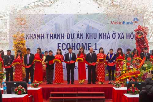 Lãnh đạo Bộ Xây dựng, UBND TP Hà Nội, chủ đầu tư, đại diện Vietinbank và chính quyền địa phương cắt băng khánh thành khu nhà ở xã hội Ecohome 1