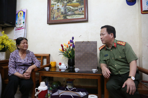 Đại tá Đoàn Ngọc Hùng ân cần thăm hỏi bà Trần Thị Bích, thân nhân liệt sỹ CAND