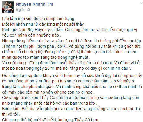 Cũng trong những dòng chia sẻ này, Khánh Thi nhắn nhủ các bậc làm cha làm mẹ đang cho con theo học mình rằng: “Đừng đem tâm huyết thầy cô giáo ra mỉa mai và đừng vì tiếc một bó hoa trong ngày 20-11 mà nói rằng họ có dạy gì con mình đâu”.