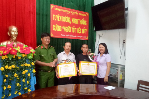 Lãnh đạo Đảng ủy, UBND và Công an phường Nguyễn Nghiêm, TP Quảng Ngãi đã trao giấy khen cho ông Lê Thanh Bình (SN1948) và Phạm Xuân Thanh (SN1960) đều trú tại phường Nguyễn Nghiêm, TP Quảng Ngãi, về hành động cao đẹp, nhặt được của rơi trả người bị mất.