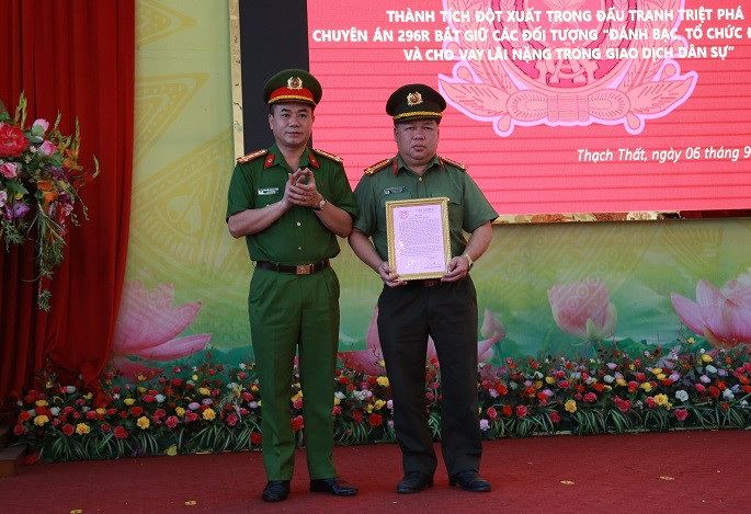 Kịp thời động viên chiến công xuất sắc của Công an huyện Thạch Thất, Ban Giám đốc Công an thành phố Hà Nội đã trao khen thưởng cho 2 tập thể và 10 cá nhân có thành tích trong đấu tranh triệt phá, bắt giữ các đối tượng đánh bạc, tổ chức đánh bạc và cho vay lãi nặng trong giao dịch dân sự.