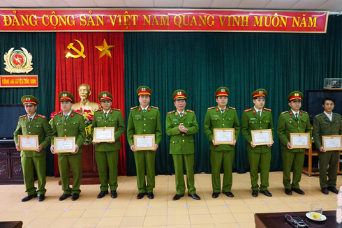 Thiếu tướng Đinh Văn Toản, Phó Giám đốc CATP Hà Nội trao Giấy khen cho tập thể, cá nhân có thành tích xuất sắc trong công tác điều tra, khám phá nhanh vụ trọng án tại Sóc Sơn