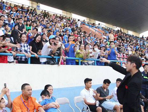 Trước trận TP.HCM gặp Cần Thơ ở vòng 7 V-League tuần vừa rồi, sân Thống Nhất bỗng náo nhiệt kỳ lạ bởi sự có mặt của hàng trăm khán giả tuổi teen trên khán đài hò reo cổ vũ. Dưới đường piste, một trong những ca sĩ đang hot nhất trong giới trẻ hiện nay - Sơn Tùng MTP say sưa hát những ca khúc hit đình đám.
