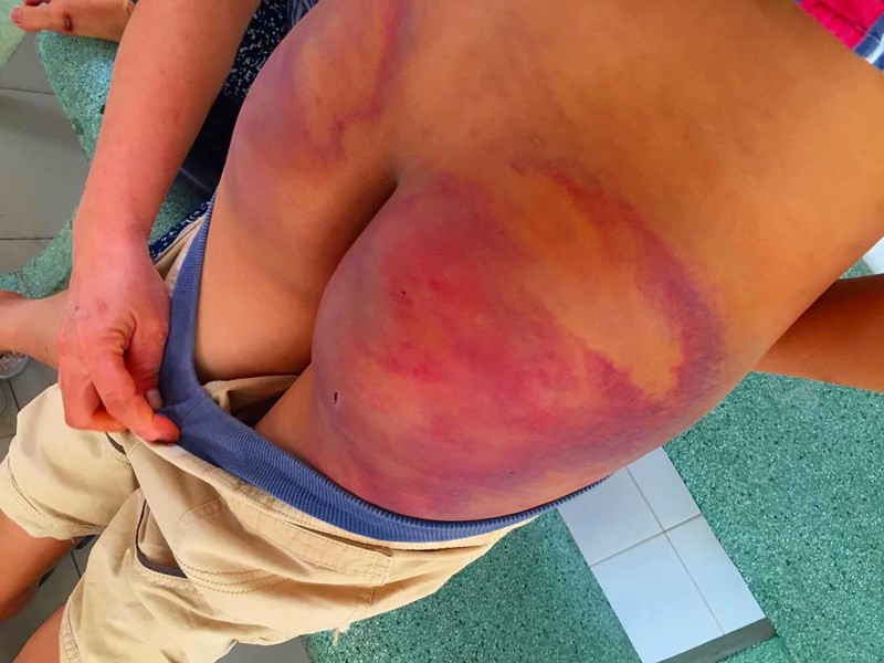 Những vết thương trên khắp thân thể em là kết quả của các trần đòn roi tra tấn, đánh đập bằng ống nước, thậm chí dọa giết khiến em ngất xỉu nhiều lần vì không chịu làm theo những gì ông ta yêu cầu.