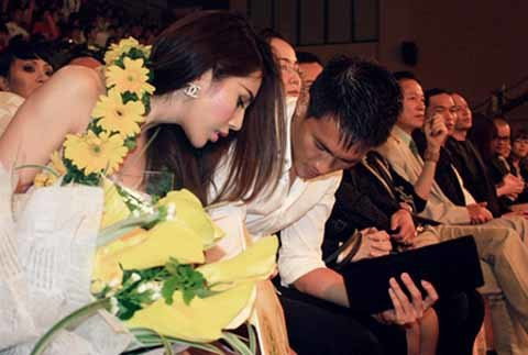 Cặp đôi Thủy Tiên và Công Vinh đã từng làm nóng các diễn đàn showbiz Việt khi bất ngờ công bố những tấm hình bán nude hết sức tình tứ và sự xuất hiện gắn bó trong nhiều sự kiện âm nhạc và thể thao nổi tiếng. Họ cũng nổi tiếng bởi cử chỉ âu yếm, thân mật dành cho nhau ngay trước đám đông. Hình ảnh mới nhất là Công Vinh không ngại cúi xuống sửa trang phục cho Thủy Tiên khi hai người tham dự một sự kiện âm nhạc. (Ảnh: Đất Việt)