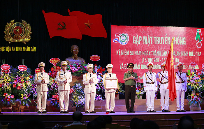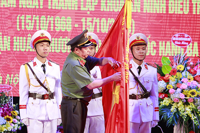 Thừa ủy quyền của Chủ tịch nước, Thiếu tướng, PGS, TS Lê Văn Thắng, Giám đốc Học viện ANND gắn Huân chương Bảo vệ Tổ quốc Hạng 3 lên lá cờ truyền thống của Khoa ANĐT